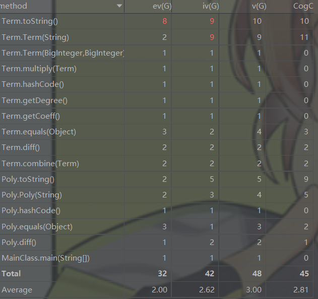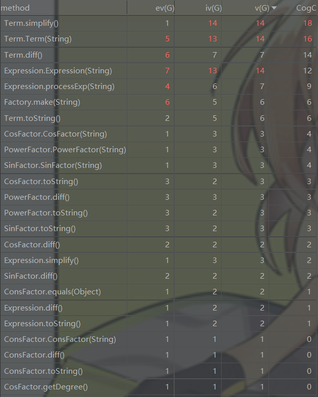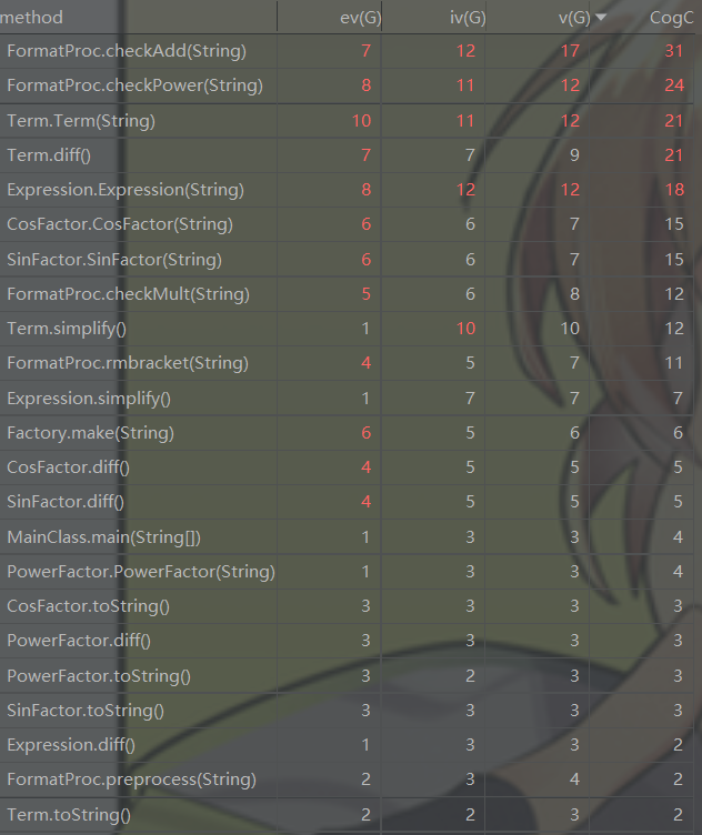 这里只放出了复杂度最高了几个方法。可以发现,就如之前说到的,将多个功能混杂在Expression和Term的构造器中,导致这两个方法的复杂度完全爆表。为了对表达式更好地简化,simplify()函数做了很多工作(如合并常数、去除多余的1、简单合并三角函数等),这才导致其基本复杂度不高,却耦合性很高。