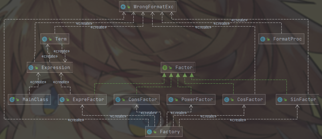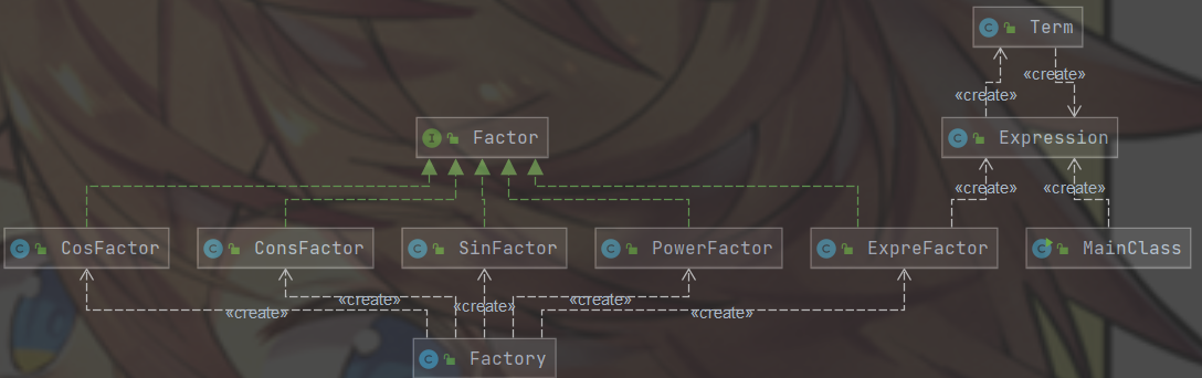 - 思路:本次加入了三角函数因子和表达式因子,这意味着之前的数据结构不能再沿用。但上一次的层级思路仍然有意义,借鉴于上次的思路和同学分享的思路,将数据分层为表达式、项、因子三层。采用递归下降的分析方法,一层一层对输入的表达式进行解析,直到因子层使用工厂模式进行因子的创建。所有因子都继承一个公共的Factor接口(仅含一个求导的