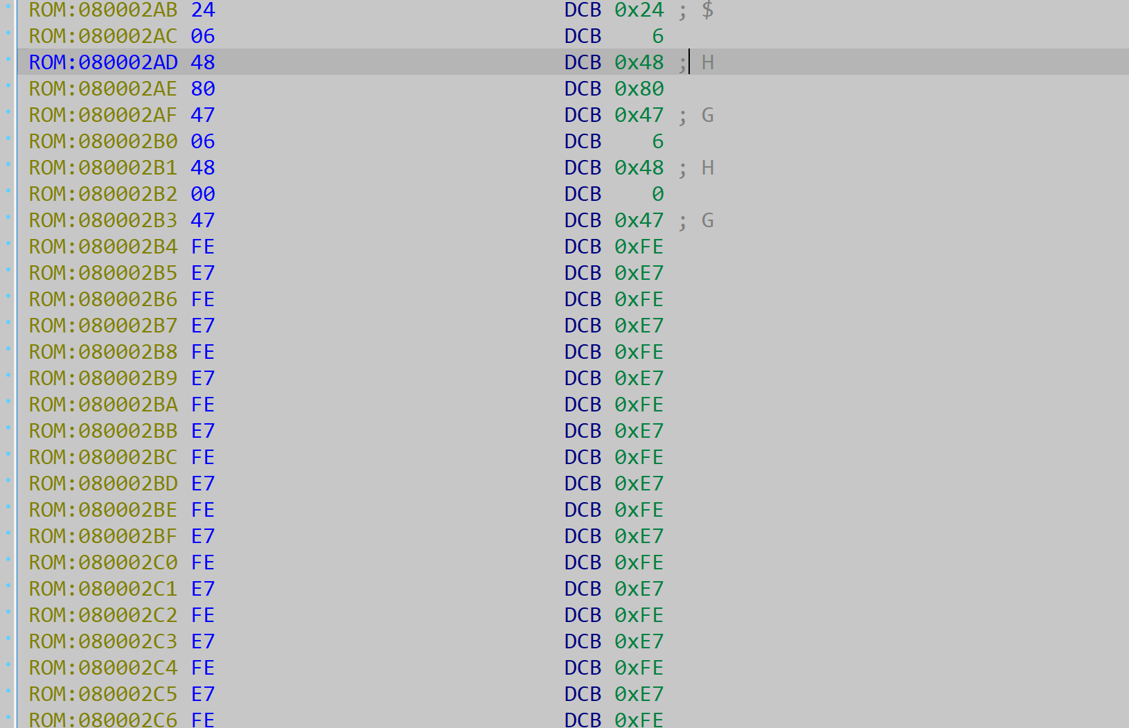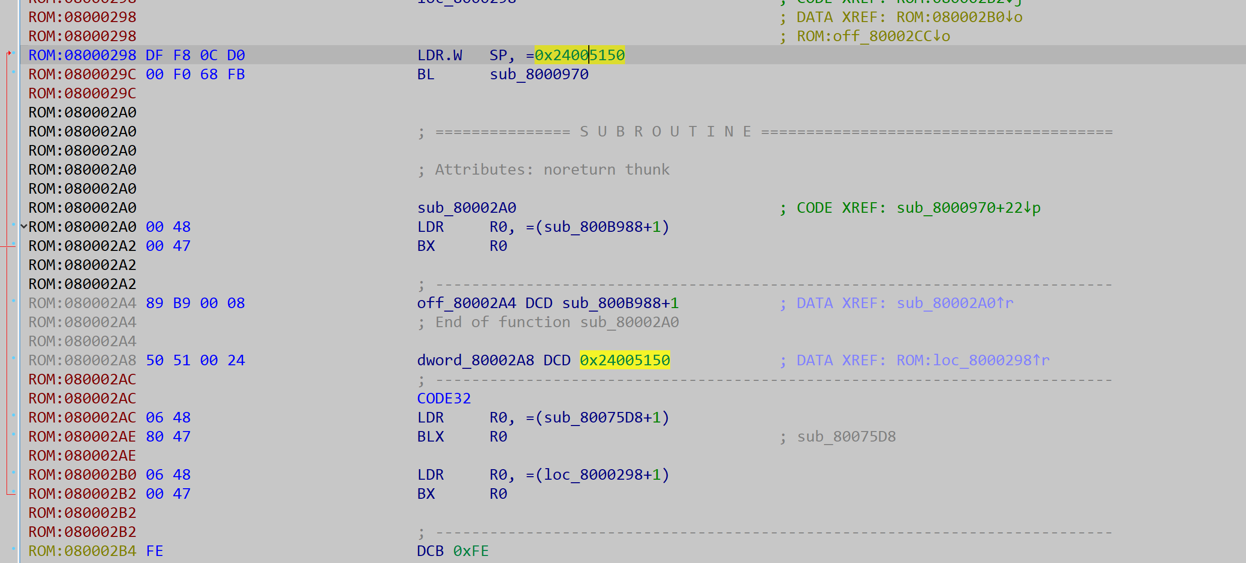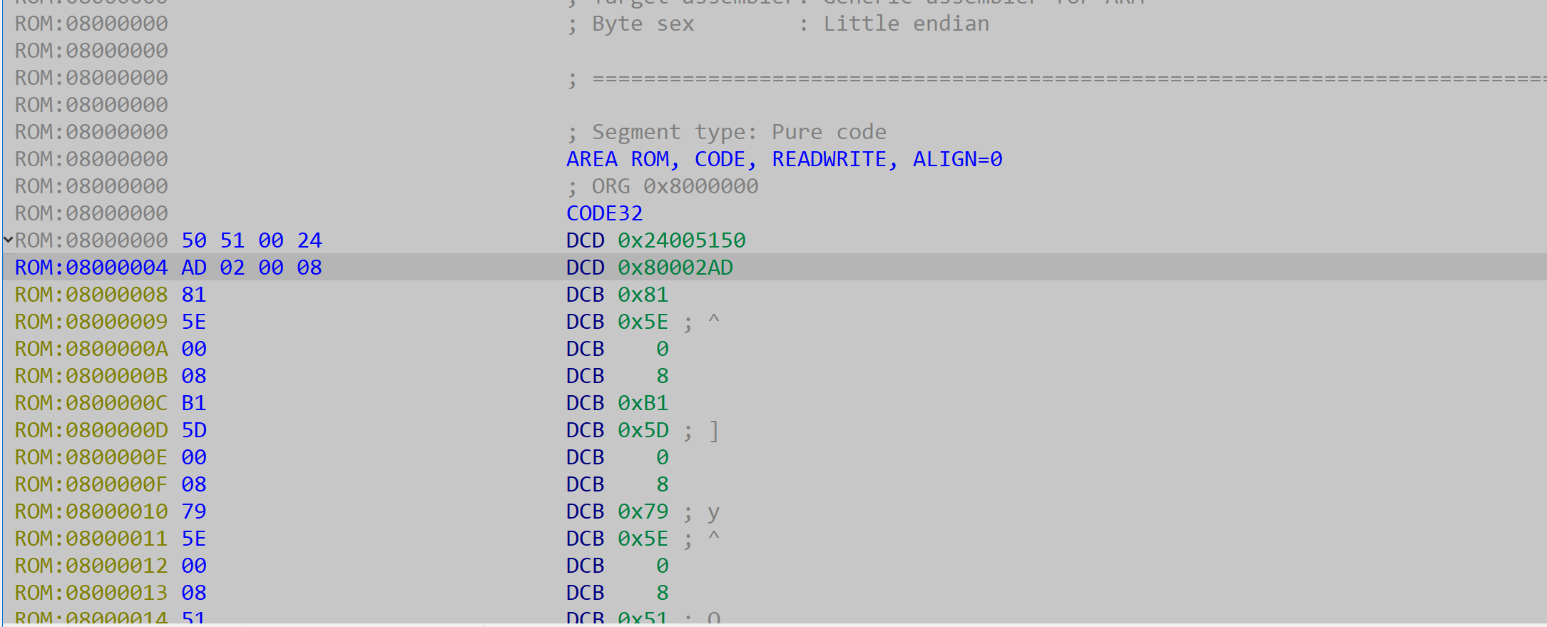 进入后先按D将最开头的8个字节换成字表示,(第一个字是中断向量表有关的,第二个字是reset handler地址,具体请看stm32的启动流程):