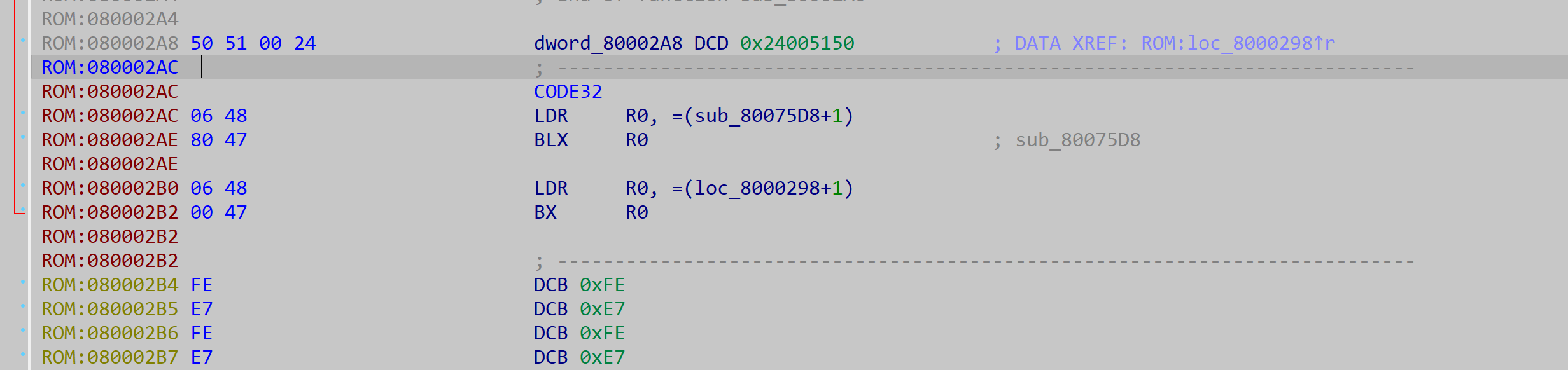 首先,使用IDA反汇编STM32代码应该打开的是bin文件,而不是.hex或.axf文件,只有bin文件是和下载到flash内的数据一致的。具体参见:三种文件的区别