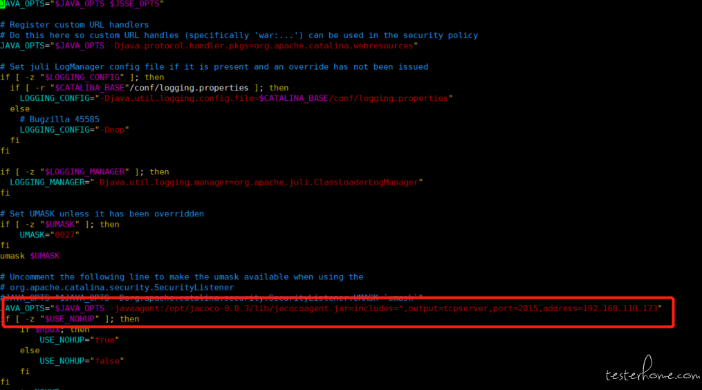 前面提到过,主要改动主要是改动java -jar,tomcat是通过一个JAVA_OPTS参数来控制额外的java启动参数的,我们只需要在合适的地方把上面的启动命令追加到JAVA_OPTS即可
