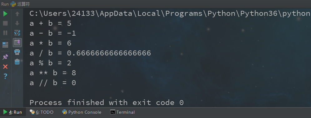 1 a = 2 2 b = 3 3 print("a + b =", a + b) 4 print("a - b =", a - b) 5 print("a * b =", a * b) 6 print("a / b =", a / b) 7 print("a % b =", a % b) 8 print("a ** b =", a ** b) 9 print("a // b =", a // b)