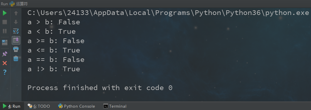 1 a = 2 2 b = 3 3 print("a > b:", a > b) 4 print("a < b:", a < b) 5 print("a >= b:", a >= b) 6 print("a <= b:", a <= b) 7 print("a == b:", a == b) 8 print("a !> b:", a != b)