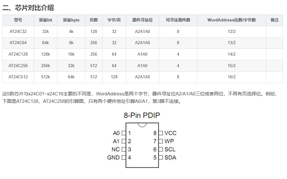 EEPROM的地址:按照规格,空间小的芯片,地址一个字节。对于空间大的芯片,地址两个字节