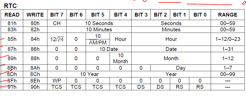 其中A4到A0可以代表寄存器的地址。我想,5bit表示的地址,翻遍了手册,在上面也没有说明5bit的地址是怎么表示的(手册上只有读写地址,8bit)。就这样,我纳闷了,就去问问搜索引擎。网上挂出来最多的尽是些代码(说实话,驱动代码不难写,难的是对芯片的理解),最终还是找到了一篇博文(写了对DS1302的理解),而且我才焕然大悟,原来READ与WRITE两列是什么的。