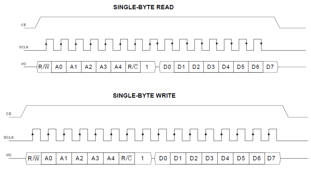 上面这张图片就是其时序图,单字节读取和单字节写。相比1条线的单总线、2条线的IIC,这个SPI貌似是最简单的。每次传送时,需要先发送8bit命令字节,再发送/接收8bit数据。