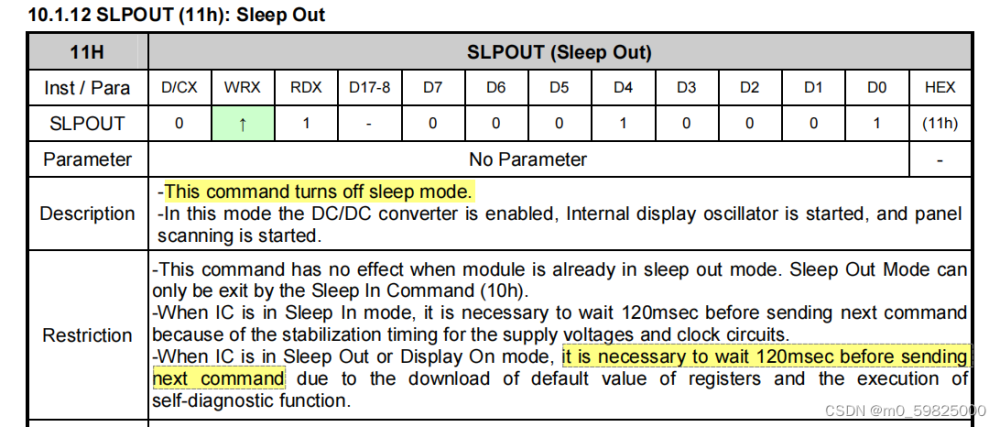 1.执行0X11命令,退出睡眠模式,执行命令后延时120ms