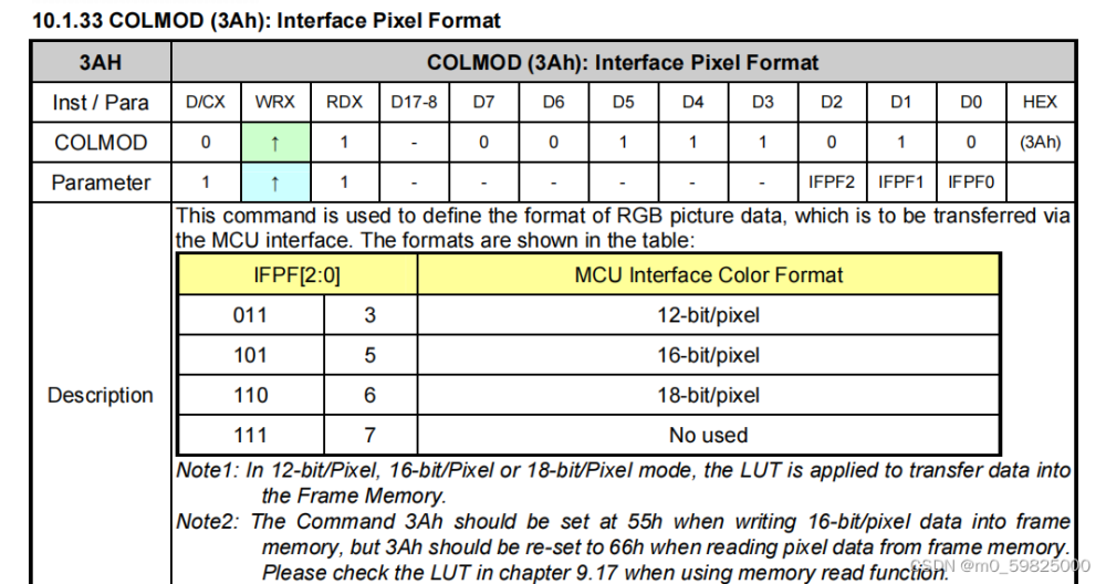 6.执行0X3A,设置像素格式
