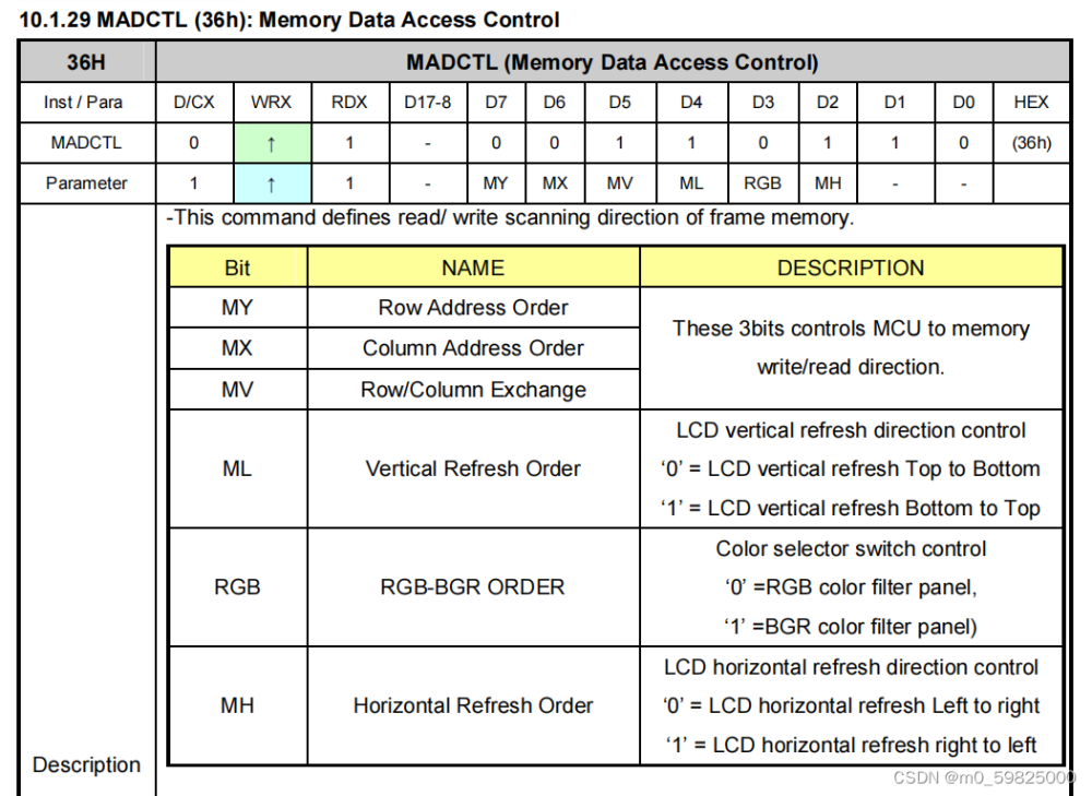 4.配置0X36寄存器,设置显存数据访问方式。我在复制代码的时候没有仔细地阅读手册,导致到最后的颜色不正,研究了半天才发现是用的BGR的颜色顺序,最开始还以为是屏幕坏了,还特地写了一个调换顺序的函数,到后来仔细读了一遍手册之后发现是有一位可以控制顺序的,36H的RGB位从1变到0颜色就正常了。
