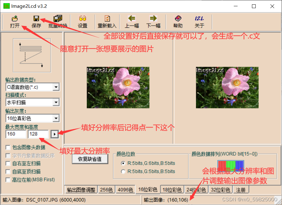 画图函数需要在像素点软件上生成一个图像数组后直接遍历数组就可以了,但是要手动的填写你需要显示的图片的分辨率,比如我现在要显示的图像的分辨率是160*120的,把地址的x和y的起始坐标写到0,终点坐标写到160-1和120-1就可以了。因为软件生成的数组是八位的,所以需要一个for循环把前后两个数据合并成一个16位的颜色数据发送出去,然后遍历一下就可以了。