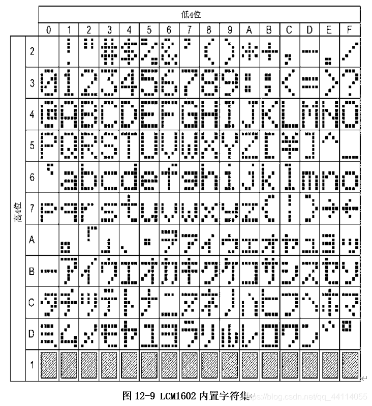 存放192个字符的点阵数据,每个字符都有一个唯一的代码,在0x20~0x7f区间代码值就是该字符的ASCII码,图12-9为LCM1602的内置字符集。