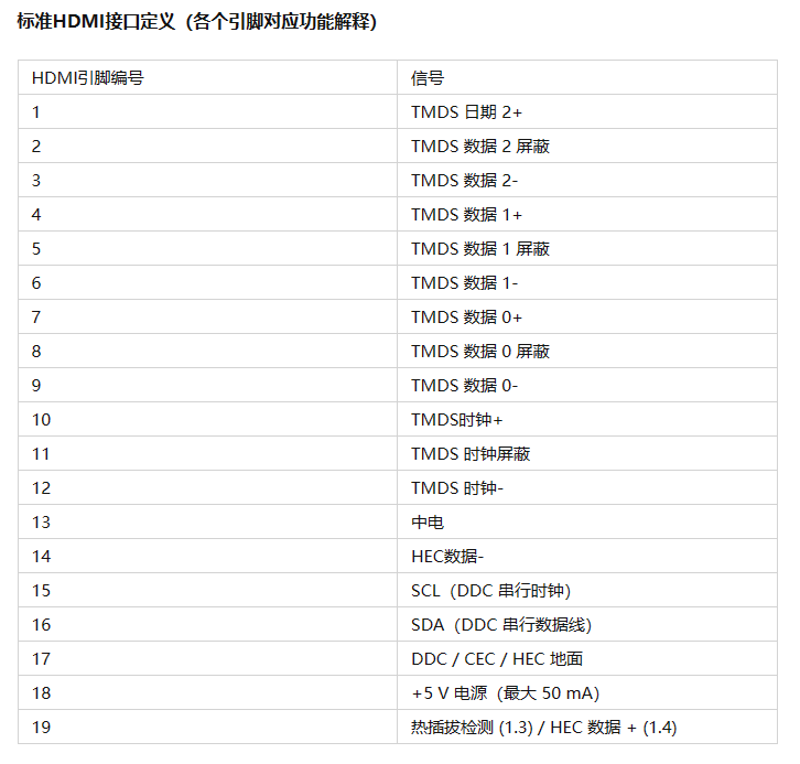 15-16 | 为I2C引脚,用于DDC(Display Data Channel,主要用于EDID与HDCP的传输)传输。在HDMI的流程中,DDC通信几乎是最先做的(前有Hotplug),因为HDMI的主从两个设备需要通过DDC来获得他们对方设备的EDID,从而得到各种信息,并且通过比较timming以确定以后送出来的timming为最合适的 |