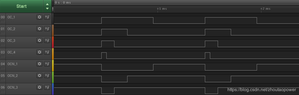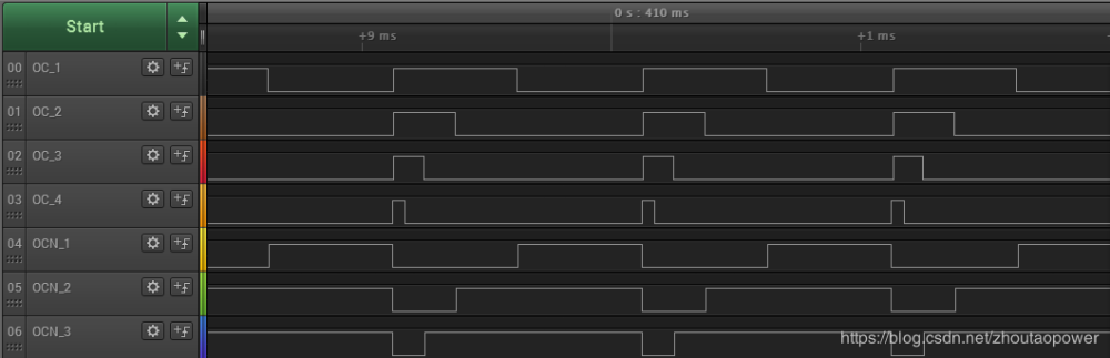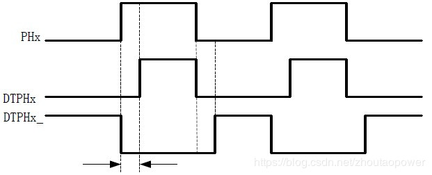 死区就是在互补的输出中,人为的插入 Delay,以致 H 桥不至于出现同时导通的情况。类似于 DTPHx 和 DTPHx_ 信号 :