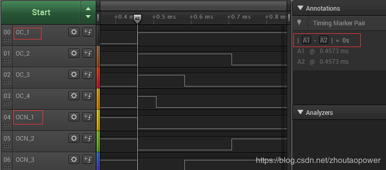 互补输出时间 delta 测量为 0,即几乎是同时输出翻转: