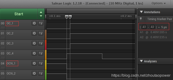 互补输出时间 delta 测量为 5us,实现死区控制: