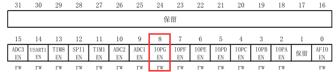 - RCC_APB2PeriphClockCmd(RCC_APB2Periph_GPIOG , ENABLE); // 此处 RCC_APB2Periph_GPIOG 为 (0x01 << 8)