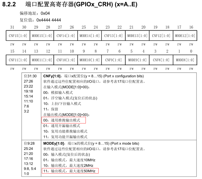 STM32 的 GPIO 可以由软件配置成为几种不同的模式,每个I/O端口位可以自由编程,然而I/0端口寄存器必须按32位字被访问: