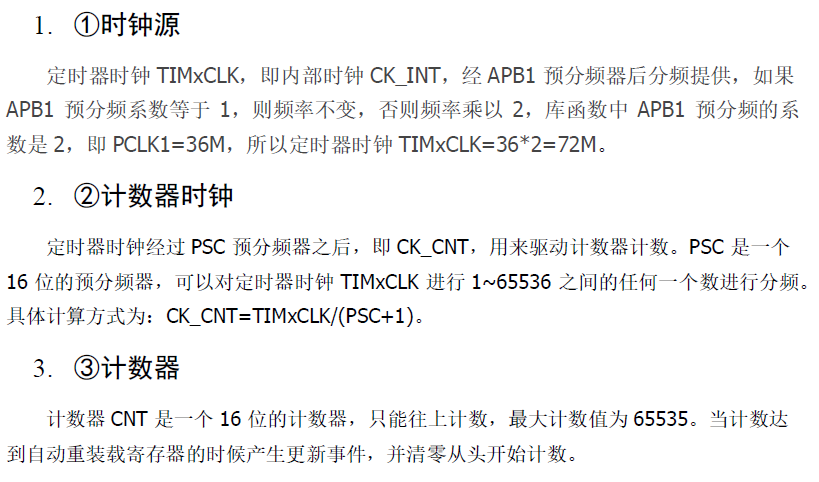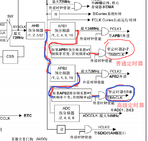 这里:APB1的时钟为分频故出来的APB2时钟还是72MHZ,TIM1是对系统时钟APB2(72MHZ)进行7200分频,
