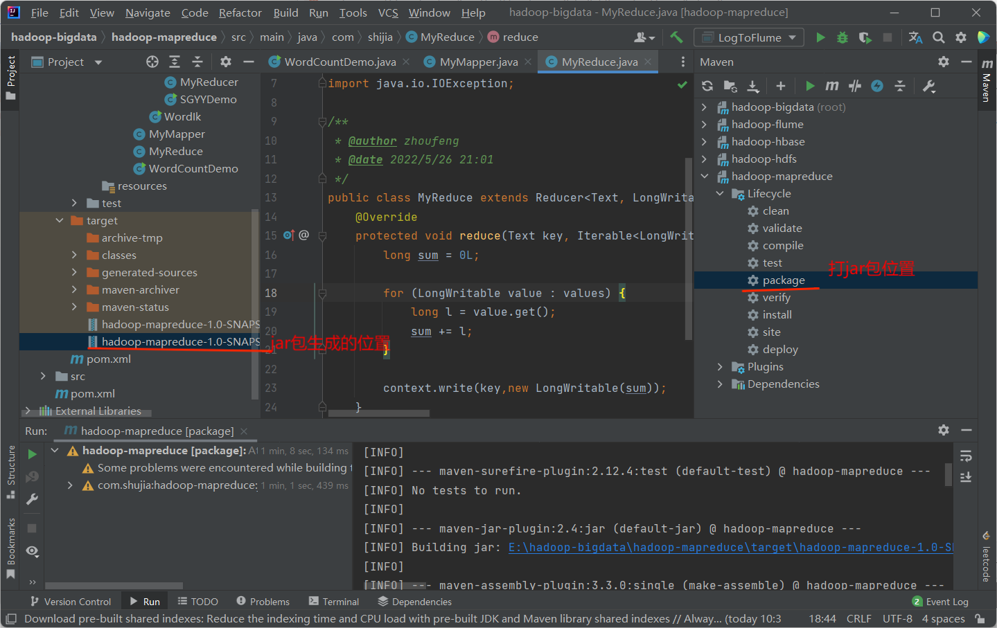 hadoop jar hadoop-mapreduce-1.0-SNAPSHOT-jar-with-dependencies.jar com.shijia.WordCountDemo /shujia/bigdata/words.txt /shujia/bigdata/res1/