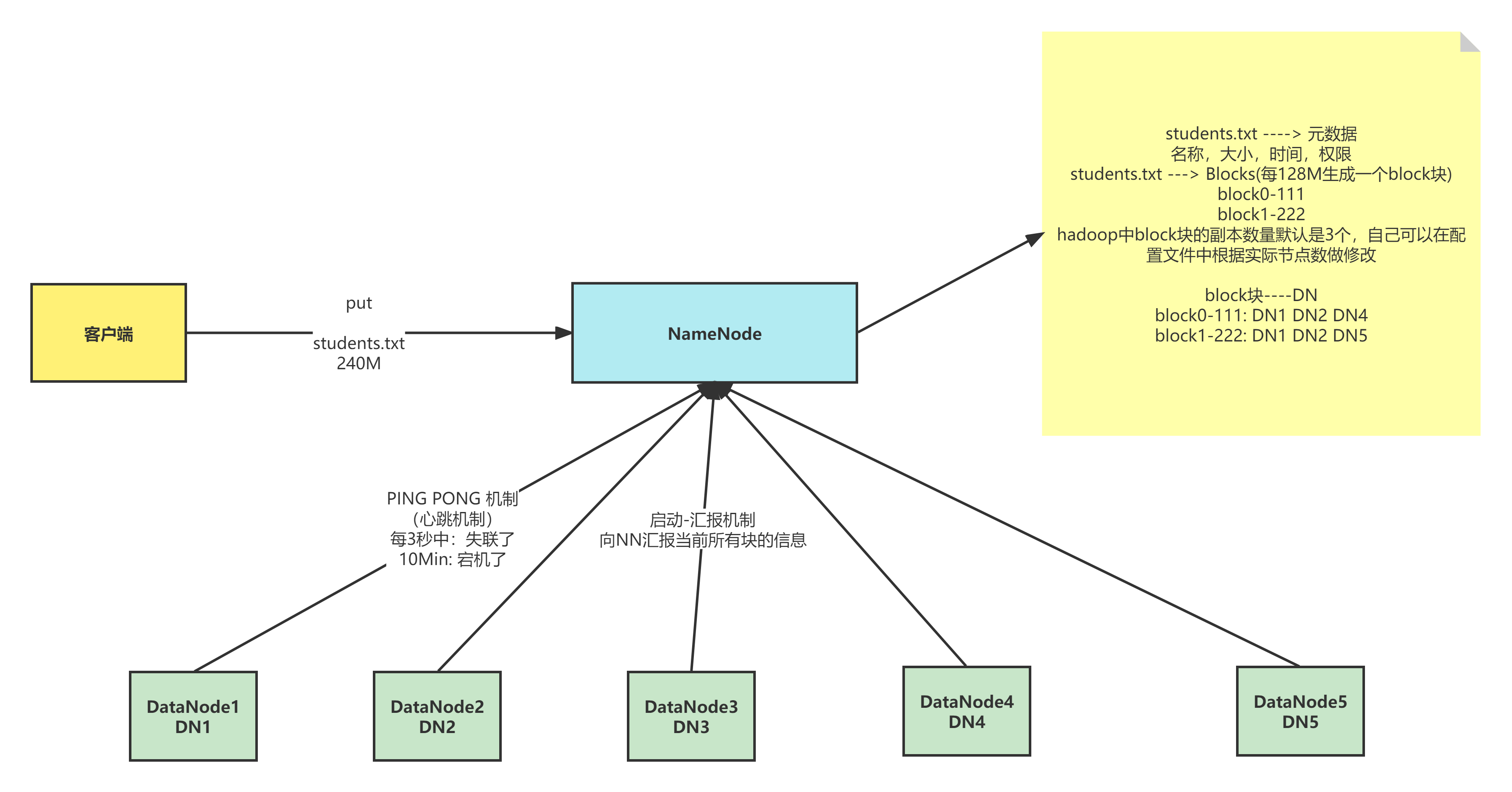 d. 如果NN与DN三秒没有心跳则认为DN出现异常,此时不会让新的数据写到这个异常的DN中,客户端访问的时候不提供异常DN节点地址