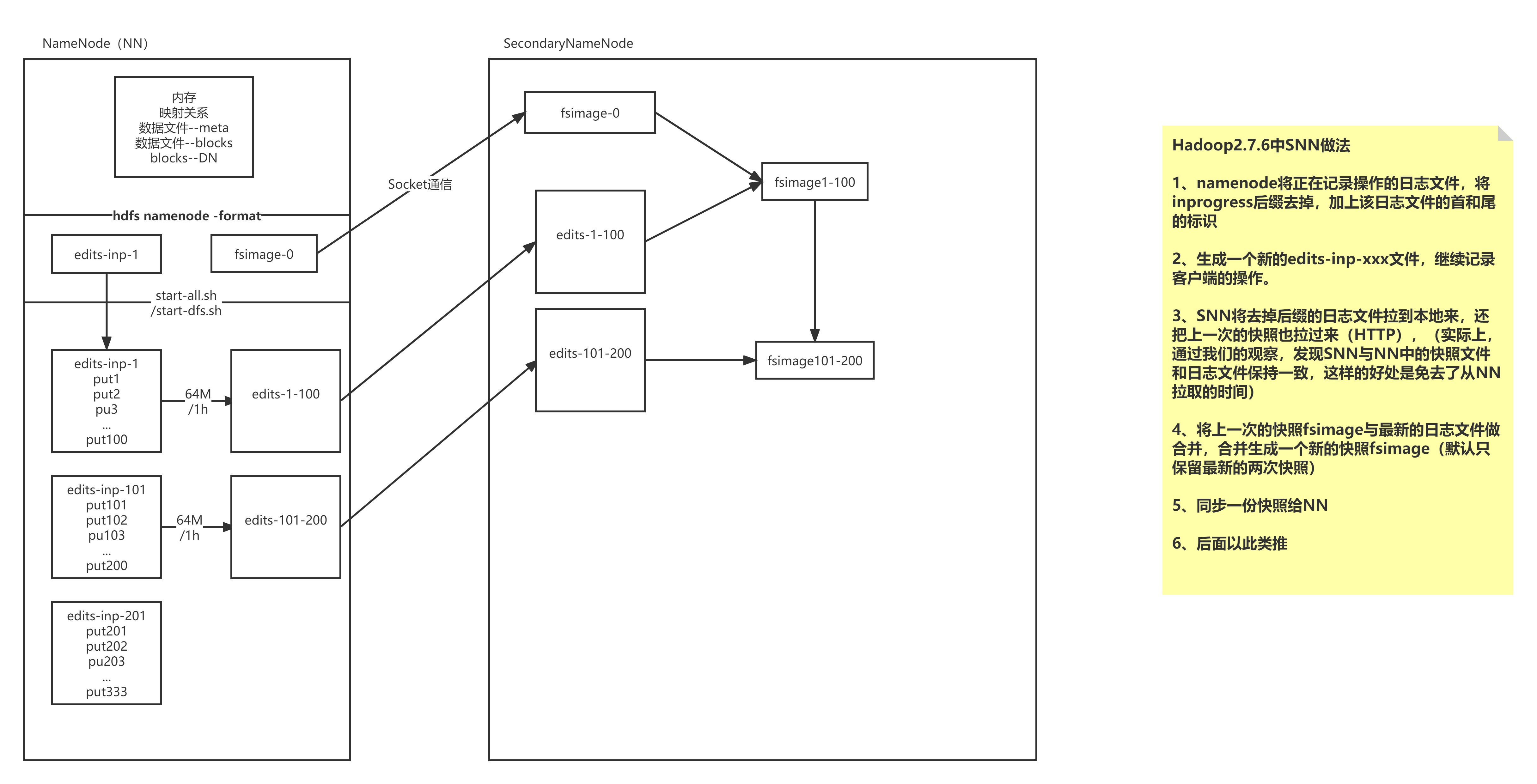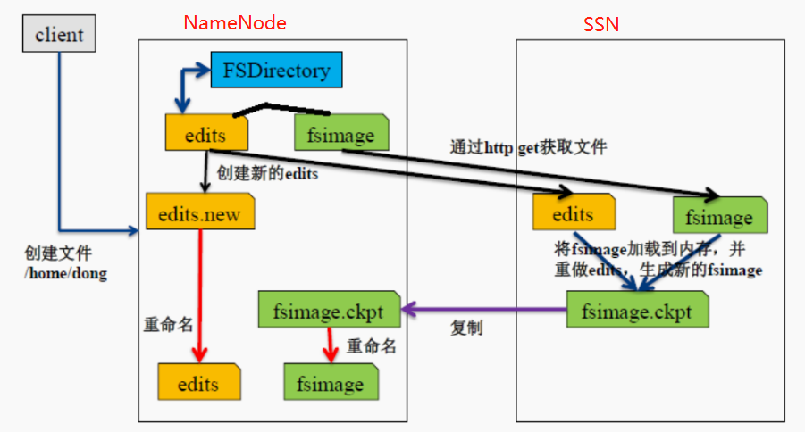 SNN将去掉后缀的日志文件拉到本地来,还把上一次的快照拉过来(HTTP),(实际上,SNN与NN中的快照文件和日志文件一致,这样的好处是免去了从NN拉去的时间)