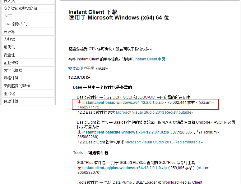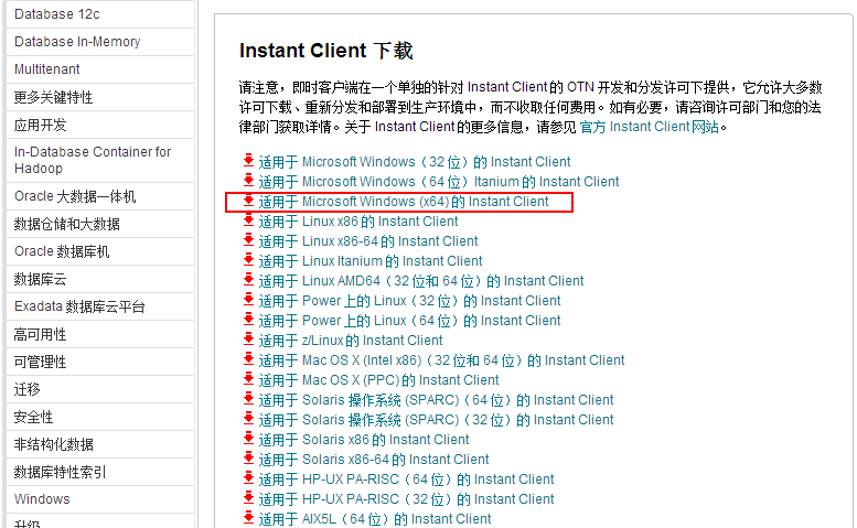 官网地址:https://www.oracle.com/technetwork/cn/database/features/instant-client/index-092699-zhs.html(见下图)