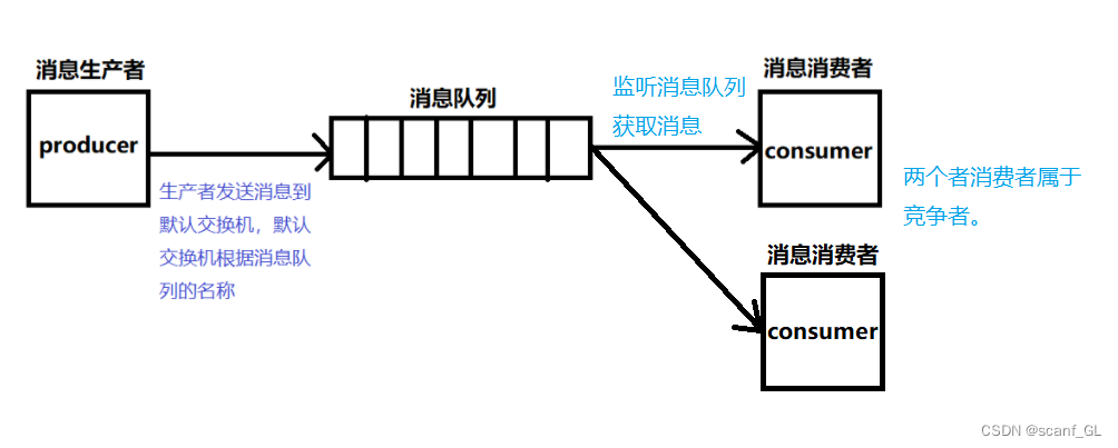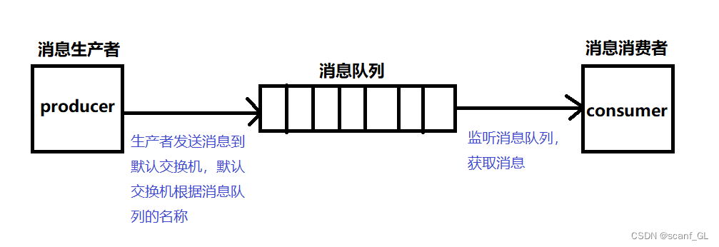 模式特点:生产者发送消息到默认交换机,默认交换机根据消息队列的名称,将消息转发到指定队列。