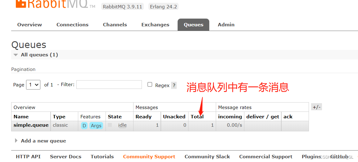 @RestController @RequestMapping("/producer") public class ProducerController { @Autowired private RabbitTemplate rabbitTemplate; @GetMapping("/sendMessage") public String sendMessage() { //RabbitTemplate实现消息发送 //参数一:默认的交换机空字符串 //参数二:路由到那个消息队列 //参数三:发送的消息内容 rabbitTemplate.convertAndSend("","simple.queue","hello world"); return "success"; } }