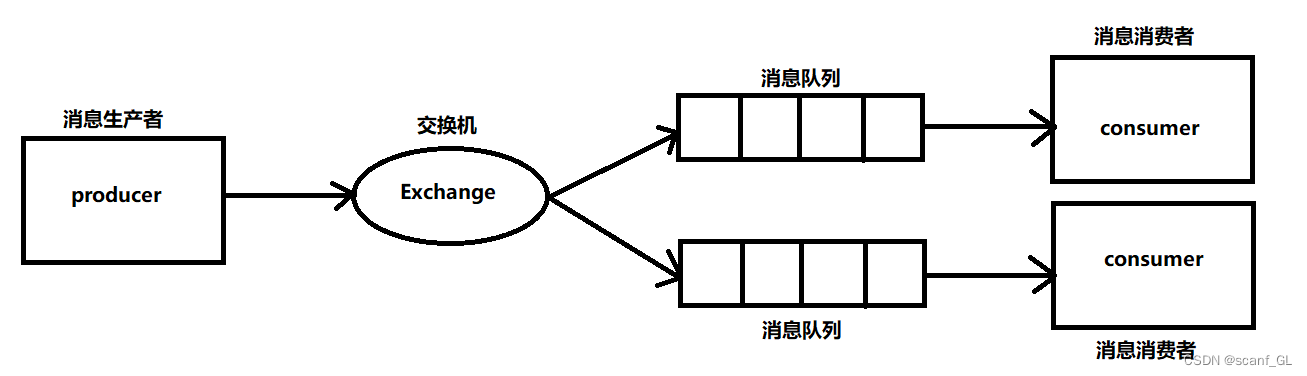 //配置类 @Configuration public class FanoutConfig { /** * 创建交换机 */ @Bean public Exchange createFanoutExchange(){ //参数一:交换机名称 //参数二:是否支持持久化 //参数三:是否自动删除 return new FanoutExchange("exchange",true,false); //构建者模式创建交换机 //return ExchangeBuilder.fanoutExchange("exchange").durable(true).build(); } /** *创建队列fqueue1 */ @Bean public Queue createFQueue1(){ return QueueBuilder.durable("fqueue1").build(); //队列名字,是否支持持久化 //return new Queue("fqueue1",true); } /** *创建队列fqueue2 */ @Bean public Queue createFQueue2(){ return QueueBuilder.durable("fqueue2").build(); //队列名字,是否支持持久化 //return new Queue("fqueue1",true); } /** *绑定交换机和队列 */ public Binding bindFqueuelToExchange(@Qualifier("createFanoutExchange") Exchange exchange, @Qualifier("createFQueue1") Queue queue){ //将队列1于交换机绑定,with是路由规则是绑定所有 return BindingBuilder.bind(queue).to(exchange).with("").noargs(); } /** *绑定交换机和队列 */ public Binding bindFqueue2ToExchange(@Qualifier("createFanoutExchange") Exchange exchange, @Qualifier("createFQueue2") Queue queue){ //将队列2于交换机绑定,with是路由规则是绑定所有 return BindingBuilder.bind(queue).to(exchange).with("").noargs(); } } 2.2.编写Controller方法向交换机发送消息 @GetMapping("/hh") public String sendMm(){ //将消息发送到exchange交换机,路由:路由到所有,默认为"",消息是:你好呀! rabbitTemplate.convertAndSend("exchange","","你好呀!"); return "OK"; }