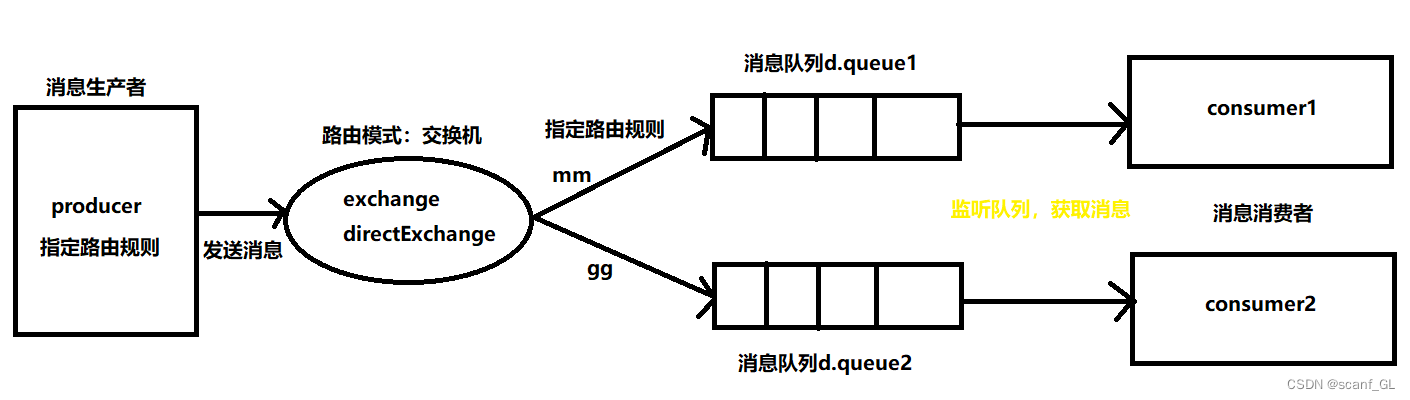 1.生产者发送消息时,需指定交换机名称(directExchange),还要指定路由规则,然后发送到交换机