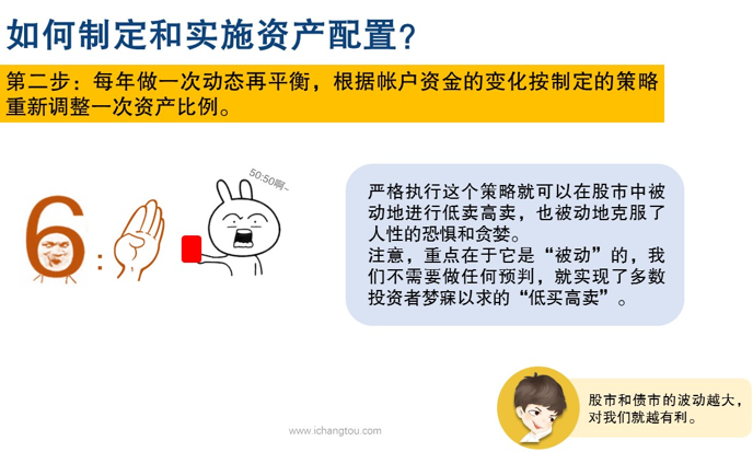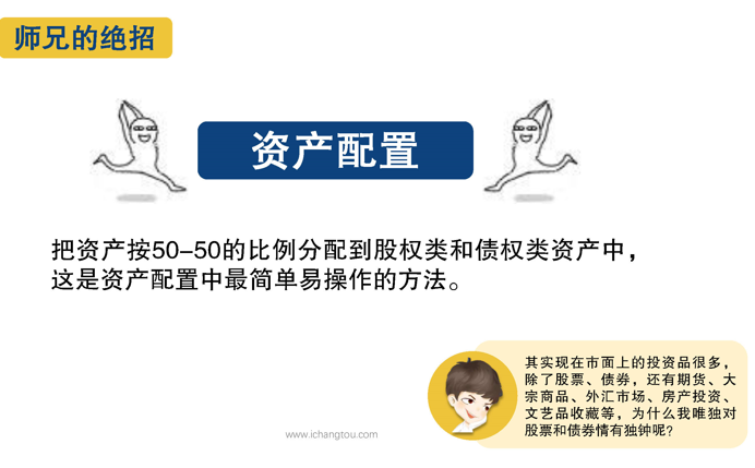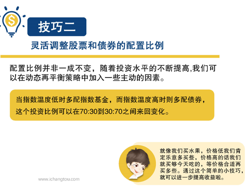 "analysis": "正确答案:C。如果想要获得更好的收益,同时更加分散风险,可以将50%的股权类资产按照指数基金的不同类型再细分,而且配置比例并非一成不变的,随着投资水平的不断提高,我们可以在动态再平衡策略中加入一些主动的因素,比如指数温度低时多配指数基金,相反的情况则多配债券,而资产配置的大忌是加入自己太多的主观因素。"