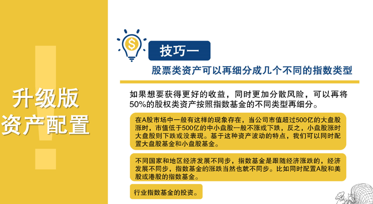 如果想要获得更好的收益,同时更加分散风险,可以再将50%的股权类资产按照指数基金的不同类型再细分