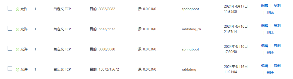 为了使得浏览器可以访问到服务器的15672端口,需要在阿里云控制台修改安全组策略,这里是有风险的操作,因为可能会使得自己的服务器被攻击,我这里只是测试。