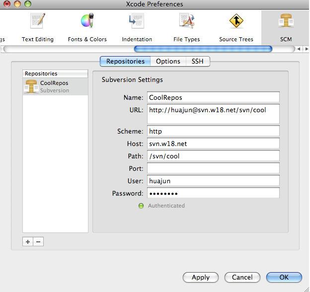 输入name,scheme,host(即svn所放的服务器),pash(即svn本地存放文件夹的路径,端口:80,用户名,密码,点击apply,则url会自动填写。authenticated即成功。