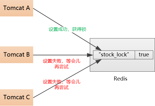 “对,MySQL不是给你们提供了一张表让你们插入数据吗? 我这里不用那么麻烦,你们Tomcat的线程,都可以尝试到我的缓存中设置一个值,比如stock_lock=true, 谁先设置成功,谁就获得了锁,可以去扣减库存。”
