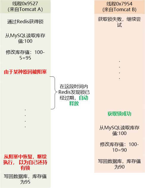 “假设Tomcat A上的0x9527获得了锁, 去执行扣减库存的操作,然后由于某种原因被阻塞了,阻塞的时间超过了过期时间,锁被你释放掉了,最终还是会出现不一致!”
