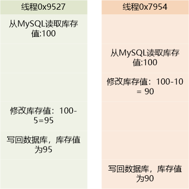 线程0x9527和0x7954又在吵架了,原因非常简单,他们俩都去做扣减库存的操作:读取库存,修改库存,写回数据库。