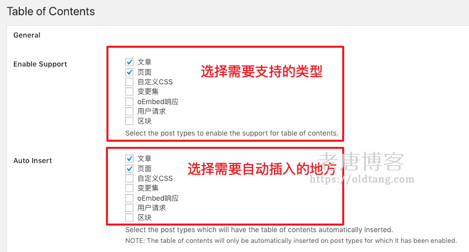 - 选择需要支持的类型,建议选择 “文章” 和 “页面”,其他的根据自己需求选择。