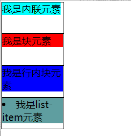 1 <!DOCTYPE html> 2 <html lang="en"> 3 <head> 4 <meta charset="UTF-8"> 5 <meta http-equiv="X-UA-Compatible" content="IE=edge"> 6 <meta name="viewport" content="width=device-width, initial-scale=1.0"> 7 <title>Document</title> 8 <style> 9 .box{ 10 width: 100px; 11 height: 50px; 12 border: 1px solid #000; 13 } 14 span{ 15 text-align: center; 16 background-color: aqua; 17 } 18 .box .blo{ 19 background-color: red; 20 } 21 .box .inblo{ 22 background-color: blue; 23 } 24 .box .lis{ 25 background-color: cadetblue; 26 } 27 .box:hover span{ 28 transform: translateX(30px); 29 } 30 .box:hover .blo{ 31 transform: translateX(30px); 32 } 33 .box:hover .inblo{ 34 transform: translateX(30px); 35 } 36 .box:hover .lis{ 37 transform: translateX(30px); 38 } 39 </style> 40 </head> 41 <body> 42 <div class="box"> 43 <span>我是内联元素</span> 44 </div> 45 <div class="box"> 46 <div class="blo">我是块元素</div> 47 </div> 48 <div class="box"> 49 <div class="inblo">我是行内块元素</div> 50 </div> 51 <div class="box"> 52 <li class="lis">我是list-item元素</li> 53 </div> 54 </body> 55 </html>