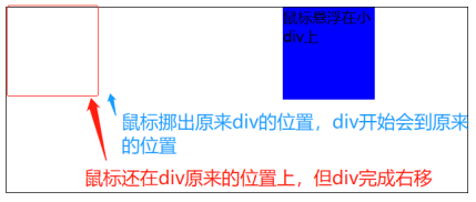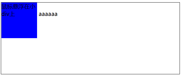 <!DOCTYPE html> <html lang="en"> <head> <meta charset="UTF-8"> <meta http-equiv="X-UA-Compatible" content="IE=edge"> <meta name="viewport" content="width=device-width, initial-scale=1.0"> <title>Document</title> <style> .box{ width: 500px; height: 200px; border:1px solid #000; margin: 100px auto; } .box>div{ width: 100px; height: 100px; display: inline-block; background-color: blue; transition: transform 1s; } .box .i:hover{ transform: translateX(300px); } </style> </head> <body> <div class="box"> <div class="i">鼠标悬浮在小div上</div> <span>aaaaaa</span> </div> </body> </html>