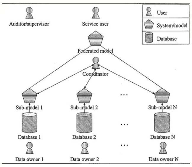 联邦学习有三大构成要素:数据源、联邦学习系统、用户。