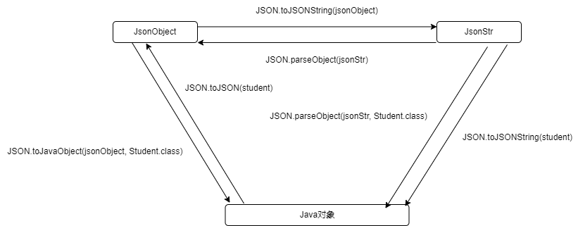 //JavaObject转化为JSONStr String jsonStr = JSON.toJSONString(user); //JSONStr转化为JavaObject Student user= JSON.parseObject(jsonStr, User.class);
