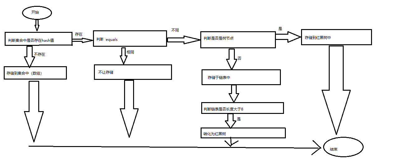 首先他会判断该对象的hash值在hashset集合中是否存在(自定义对象要自己实现hashcode方法和equals方法,String等已经实现不需要自己再实现),如果不存在则存入集合(这个时候就用到它的数据结构了,数组!!!其实存入的就是数组),如果存在相同的hash值,则判断equals方法,相同就不存,如果不同,则证明,该集合中存在与该对象相同的hash值但是值不同的对象,就会再判断它是否有树结点,有就转换为红黑树,否则,就存入链表,如果链表值大于8就会转换为红黑树,下边是它的流程图。
