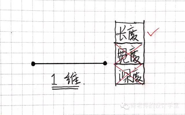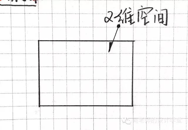 我们拥有了一条线,也就是拥有了一维空间。如何升级到二维呢?很简单,再画一条线,穿过原先的这条线,我么就有了二维空间,二维空间里的物体有宽度和长度,但是没有深度。你可以试一试,在纸上画一个长方形,长方形内部就是一个二维空间。