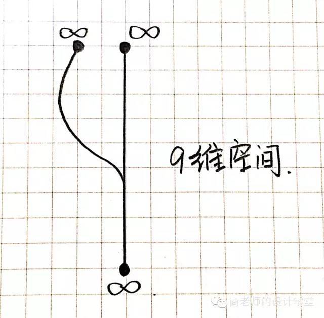 八维空间继续升级。还是那个“你”,以八维空间的点为起始,我们必须想出所有的可能,每一种可能都与八维的这个点相连,最后,我们得到十维空间里的一个点,充满着九维空间中所有可能性的连线。