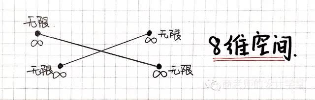 还记得文章开始时提到的一维的线么?我们把另外一条线穿过它,就变成了二维空间。同样的道理,我们来给七维空间升级。例子呢,还是那个“你”。我们又找到了两个点,一个是由“大学毕业的你”为开端产生的七维无限点,另一个是由“50岁的你”为开端产生的无限点。将这两点连线,与上文中那条连接“初中毕业的你”无限点“小学毕业的你”无限点的这条线相交。我们就得到了八维空间!