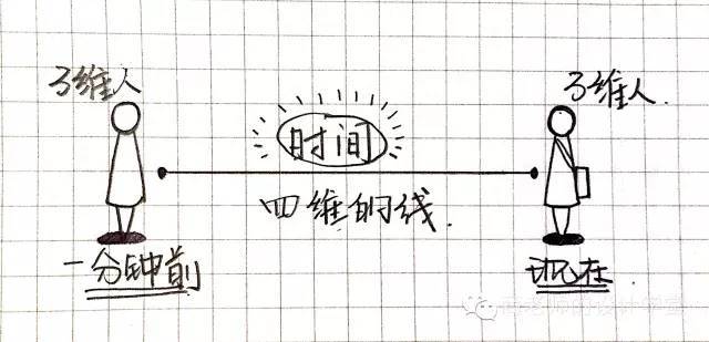 想象一下,左边有一个1分钟之前的我,右边则是现在我,将这“两个我”看成两个点 ,穿过他们连线,它就是四维空间里的线。太棒了,四维空间出现了!