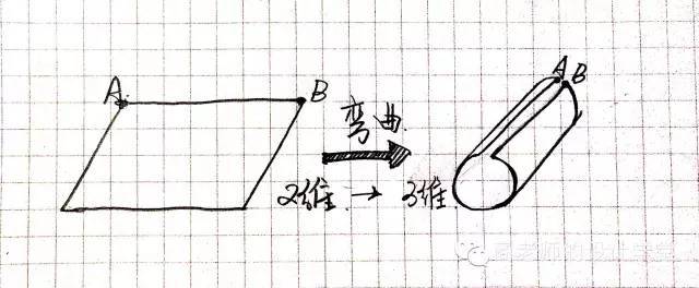 再解释一遍,在这个图示上,蚂蚁从A点消失,B点出现,你们想想,就是这意思,卷曲产生新的维度!