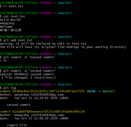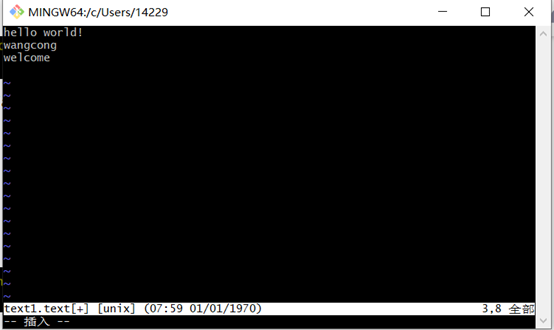我们在编辑器中插入一段文本后,按下ESC进入命令模式,再按下 :wq 强制保存退出到git命令行界面