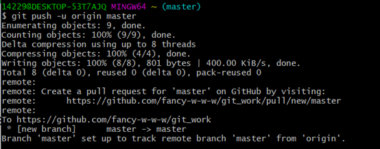 最后将合并后的master分支使用git push origin master提交到远程仓库,模拟完成了一项开发任务的场景。